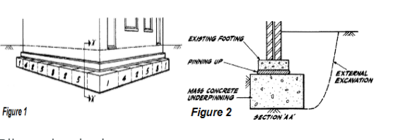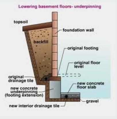 When underpinning a house, the existing foundation walls and footings are extended to a lower level, allowing the basement floor to be safely excavated for additional headroom or living space.